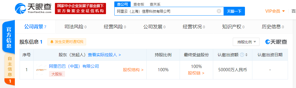 据天眼查APP显示,11月9日,阿里云(上海)信息科技有限公司成立,法定代表人为周明,注册资本5亿人民币,经营范围含信息系统运行维护服务;软件开发;数据处理和存储支持服务;网络技术服务;电子元器件零售;电子产品销售;信息安全设备销售等。该公司由阿里巴巴(中国)有限公司全资持股。