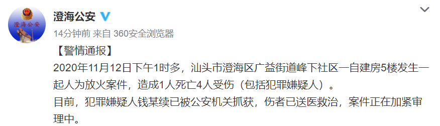 据@澄海公安 微博消息,2020年11月12日下午1时多,汕头市澄海区广益街道峰下社区一自建房5楼发生一起人为放火案件,造成1人死亡4人受伤(包括犯罪嫌疑人)。目前,犯罪嫌疑人钱某续已被公安机关抓获,伤者已送医救治,案件正在加紧审理中。