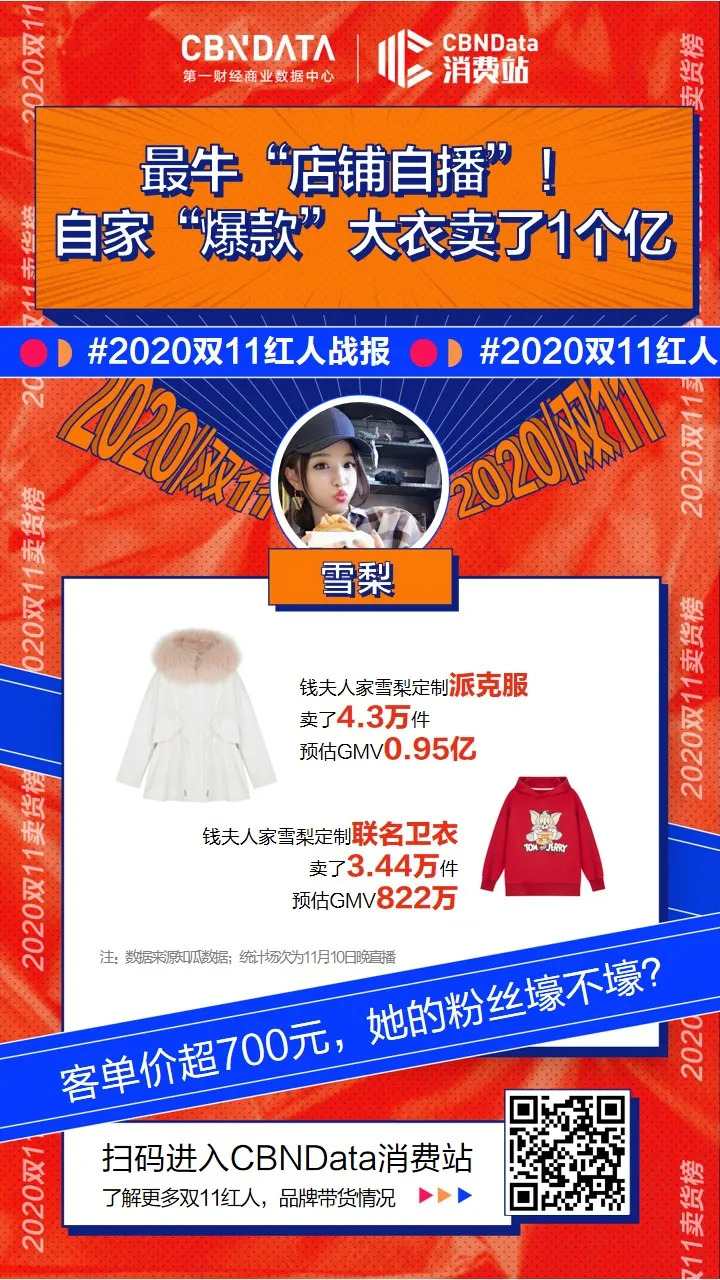 另一主播雪梨,因为背后拥有一家top3级别的淘系女装店铺,在直播策略上与薇娅、李佳琦的差异不小。11月10日18:00,雪梨准时开播,当天的产品都是自家店铺“钱夫人家-雪梨定制”的服装,吸引1700万人次观看。