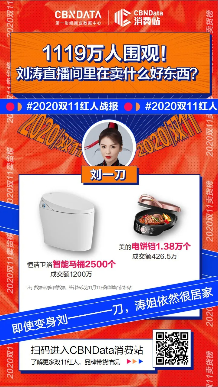 刘涛成为主播后的第一个双11,战绩表现可圈可点。根据知瓜数据,当场直播销售额为9000万,评论区热词包括“睡袋”、“刘涛”、“茅台”。从单品销售额来看,刘涛的居家属性爆棚,热销产品top 3分别为恒洁马桶、容声冰箱、美的电饼铛,其中马桶销售额达到1200万。