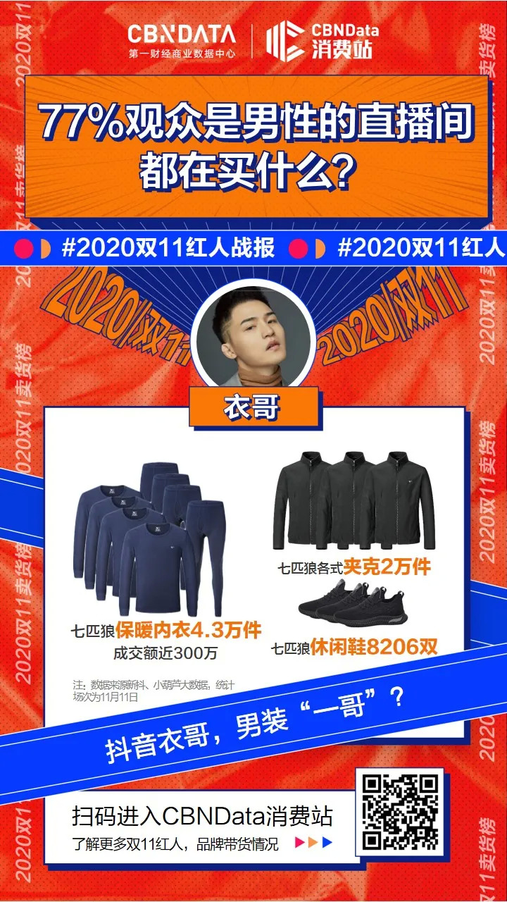 宠粉节期间,衣哥为慕尚GXG和七匹狼两个服装品牌做的专场直播销售额均破千万。11月11日的七匹狼专场直播中,保暖内衣、夹克、休闲鞋登销量前三甲。要风度更要温度,当代直男的消费风尚你get了吗?