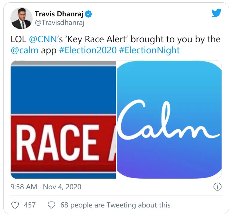 Calm 的发言人对 TechCrunch 说:“这个选举周期的不确定性可能会让我们许多人感到焦虑,尤其是这还是疫情期间。我们在 CNN 的选情快报投广告,是为了给观众提供片刻的宁静,并提醒他们在紧张的夜晚深呼吸。”