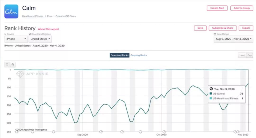 App Annie 说,在美国 iPhone 应用商店总榜上,Calm 比选举日前一天上升 20 位,排名第 79 位;同时它是“健康与健身”类别的榜首。