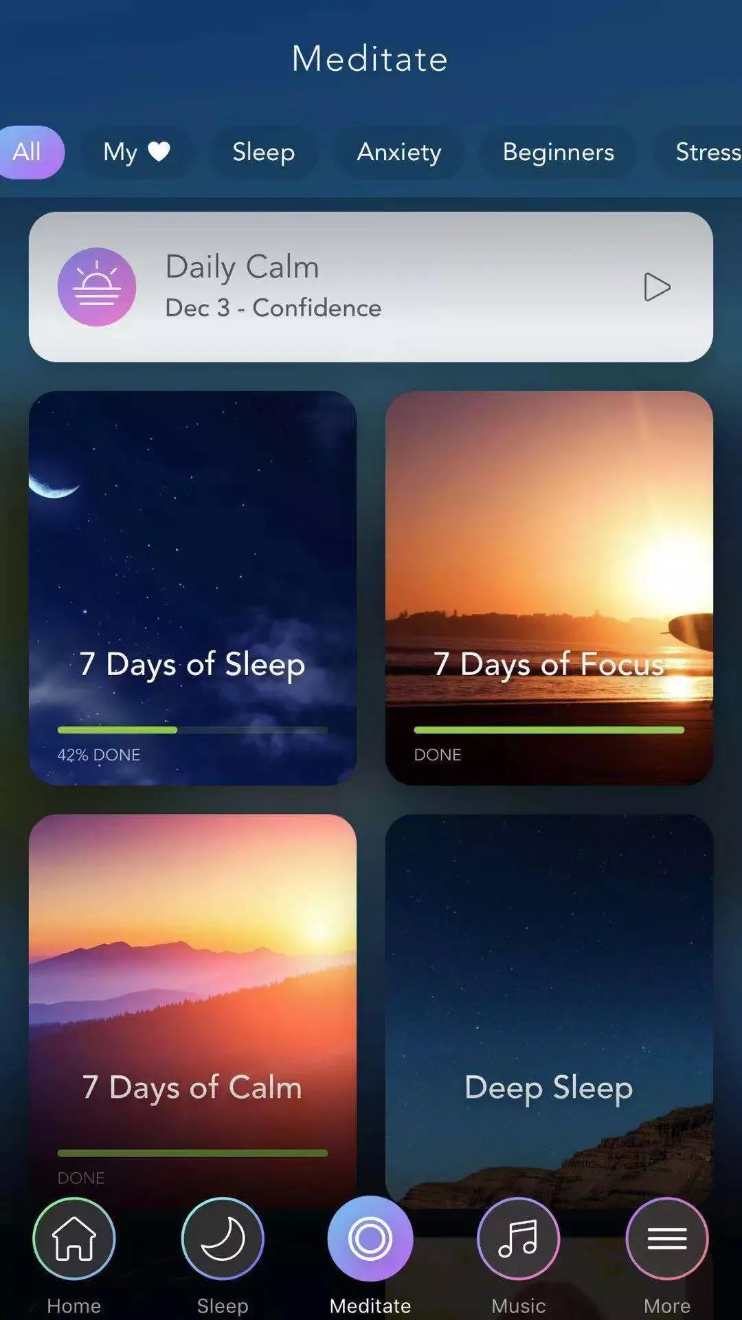冥想课程中的辅助背景音,有各种自然界的声音如细雨、雷雨、壁炉、溪流、潮汐、泉流、湖泊等,其实也可以作为白噪音使用。选择对应课程后会提供语音指导,对不容易静下心来的冥想初学者也许有帮助。