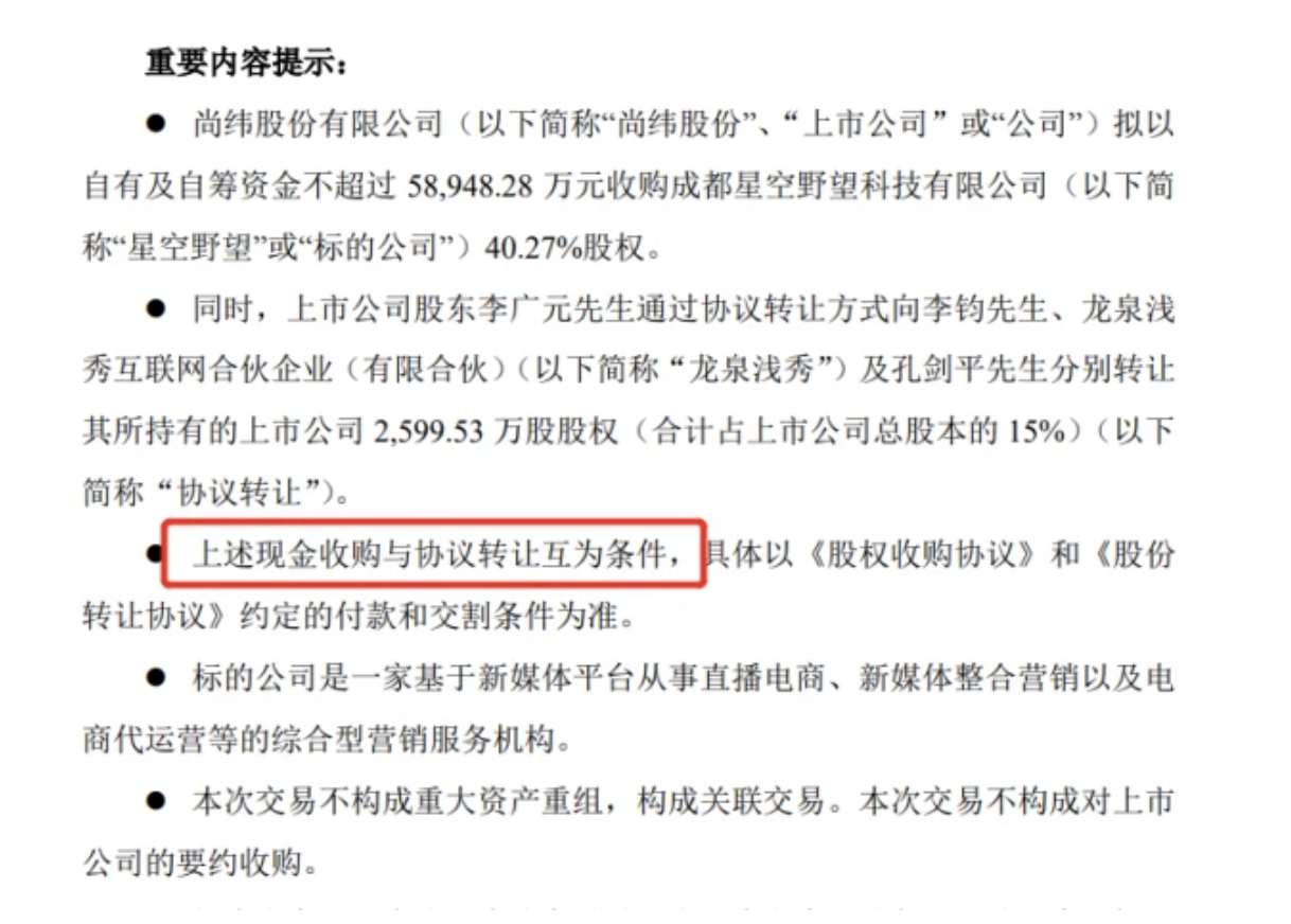 与此同时,由于现金收购与协议转让"互为条件",星空野望如果要并入尚纬股份,就必须要用获得的部分股权转让款接手李广元所持的部分股份。