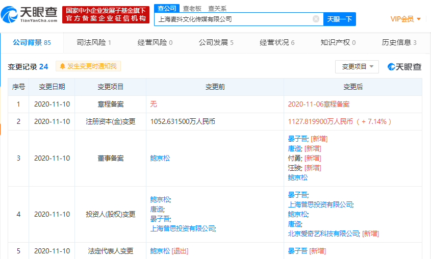 11月13日消息,据天眼查APP显示,近日,上海麦抖文化传媒有限公司发生工商变更,新增投资人北京爱奇艺科技有限公司,持股比例为6.67%;此外,公司注册资本增加7.14%,约1127.82万人民币,公司法定代表人由鲍京松变更为晏子吾。