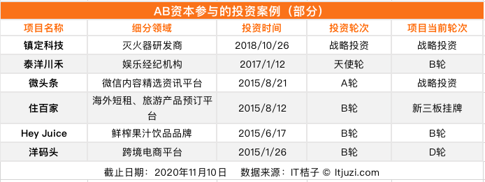AB Capital 到目前有 6 笔公开投资事件,最新的一次公开投资也是两年前了。已投资项目包括海外短租旅游预定平台「住百家」、跨境电商「洋码头」、杨颖本人曾经所在的经纪公司「泰洋川禾」以及她本人也代言了的鲜榨果汁饮品 Hey Juice 等。