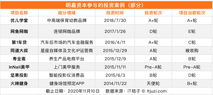 根据 IT 桔子数据,明嘉资本共有 15 笔公开投资案例,涉足体育、教育、硬件消费品、泛娱乐、汽车等多个领域,但最后一次出手时间与 AB Capital 一样,停留在了 2018 年中。
