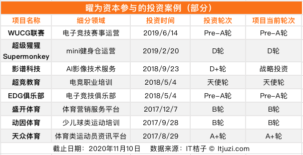 根据 IT 桔子数据,曜为资本公开了 16 家投资项目,其中体育产业有 12 家,包容爱奇艺体育(A+轮)、天众体育(A+轮)以及少儿球类运动培训机构「动因体育」(B 轮)、电竞职业技能培训机构「超竞教育」(天使轮)等。