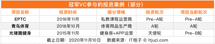 根据 IT 桔子统计,冠军 VC 公开过投资的项目仅有 3 家,包括光猪圈健身(天使轮)、青鸟体育(A 轮)和 EPTC(Pre-A 轮)。其中仅有光猪圈健身获得了后续融资,目前融资到了 Pre-B 轮,该项目的资方是上市公司「中体产业」。