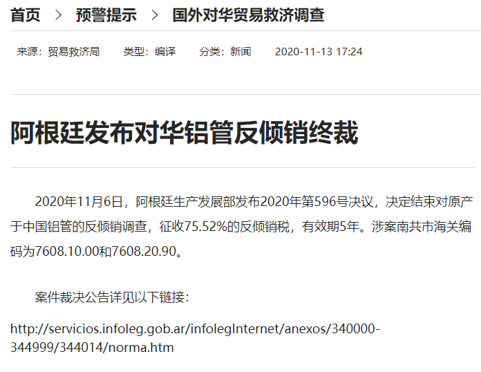 11月13日,商务部网站通报称,2020年11月6日,阿根廷生产发展部发布2020年第596号决议,决定结束对原产于中国铝管的反倾销调查,征收75.52%的反倾销税,有效期5年。涉案南共市海关编码为7608.10.00和7608.20.90。