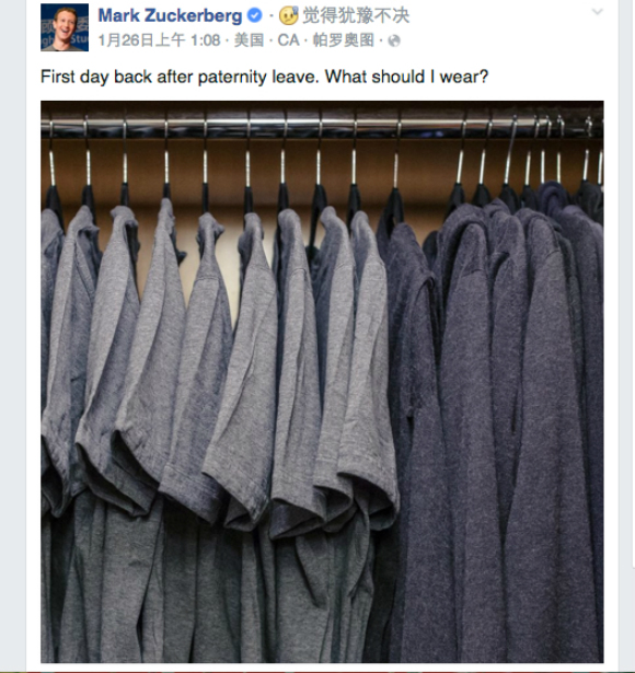 美国当地时间1月25日,扎克伯格在Facebook上贴出了他的衣柜照片,询问网友他应该穿哪件衣服去上班。这一“卖萌”的举动逗乐了关注他的4860多万网友——谁都知道,他的衣橱里只有两种衣服,浅灰色的T恤和深灰色的卫衣。