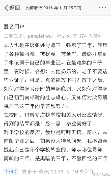 现在才爆出来,非得出人命才敢爆料我就想问,那些学姐学长们,你们早干啥来的, 还不是已经出了人命才敢出来指责吗?之前还不是明哲保身做些缩头乌龟!导师能够猖狂如此难道不是你们一手促成的吗?