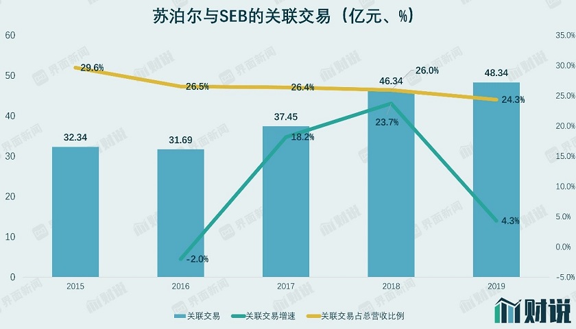 SEB入主苏泊尔时,双方签署了《战略投资框架协定》。此后,苏泊尔可以从SEB集团获得大量的OEM订单。SEB集团也逐步将其亚洲产能向苏泊尔转移。这样一来,就形成了苏泊尔账面大量的关联交易。目前,苏泊尔有大约四分之一的收入是和其母公司SEB集团之间的关联交易,也就是为SEB集团代工。