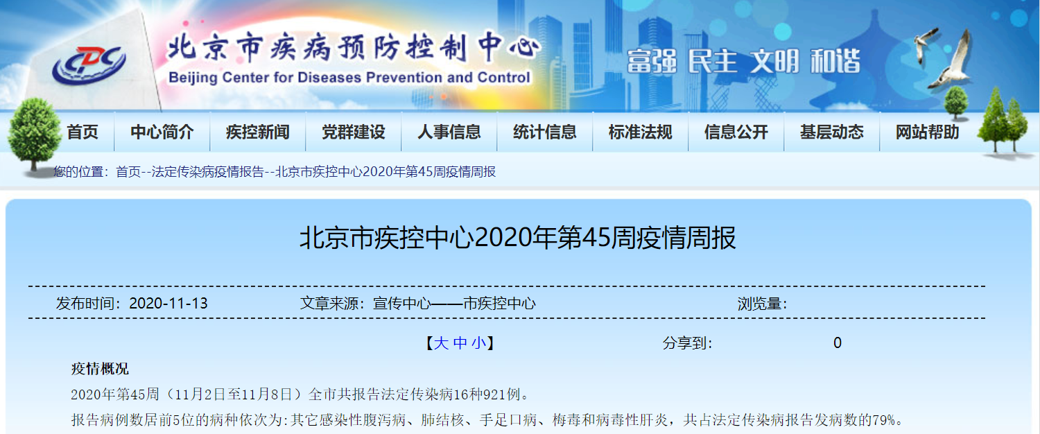 据北京市疾病预防控制中心网站消息,2020年第45周(11月2日至11月8日)北京市共报告法定传染病16种921例。