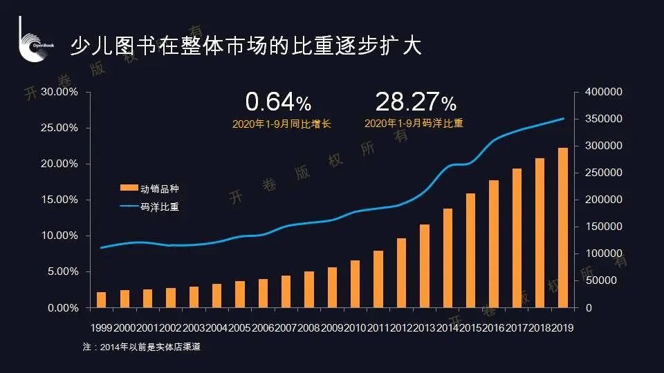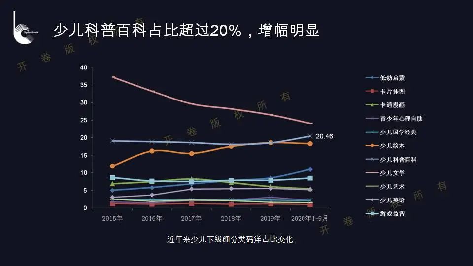 据开卷公司常务副总裁杨雷介绍,目前,少儿图书市场已经成为国内码洋比重最大的类别。少儿类图书市场一直是近五年来增速最快的细分类市场之一:自2015年至2019年,少儿图书市场占整体图书市场的码洋比重持续增长,从20.22%增长至26.35%。即使今年在新冠疫情的影响下,少儿市场也实现了正向增长,占据整体市场中28.27%的码洋比重,依然是码洋比重最大的类别。