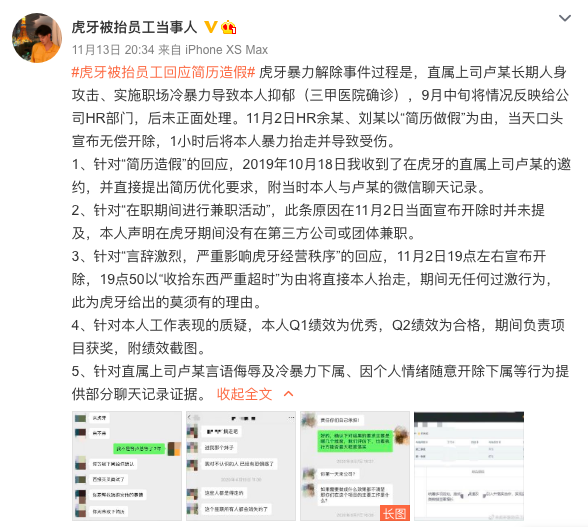 ”虎牙员工称被HR抬出公司”事件持续发酵。11月13日晚间,“虎牙被抬当事人”在个人微博上就此事再度做出回应。针对此前虎牙11月7日发表声明中提到的简历造假、兼职活动等系列问题给予否认。