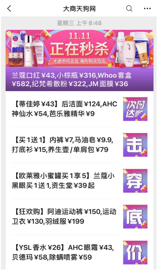 一直致力于打通公域私域流量,大商集团自然不会放过双十一的机会。双十一正式开始之前,大商天狗就通过自己的服务号,把优惠信息送达600万粉丝。