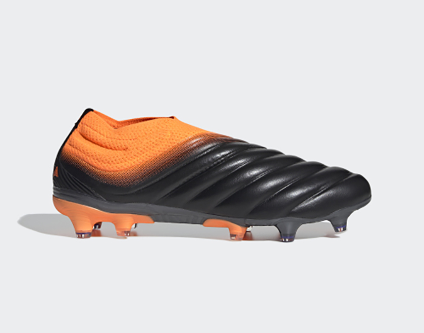 这款鞋采用了黑橙配色,鞋面采用袋鼠皮革搭配针织面料,整体材质较柔软。与前两款类似,adidas COPA 20+ FG也适合在硬天然草坪穿着。