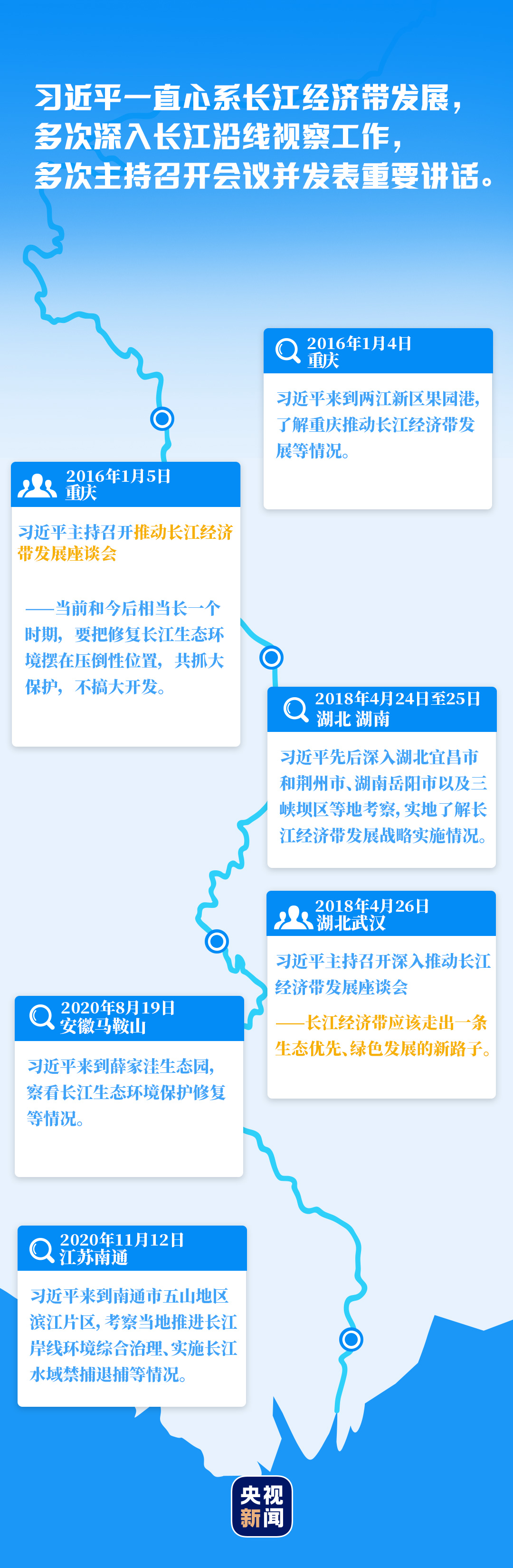 长江,中华民族的母亲河,习近平一直牵挂于心。到长江沿岸城市,登大坝、乘江船、进企业、访农家……几年来,习近平多次实地考察调研长江生态环境修复工作,两次主持召开座谈会,为长江经济带发展把脉定向。