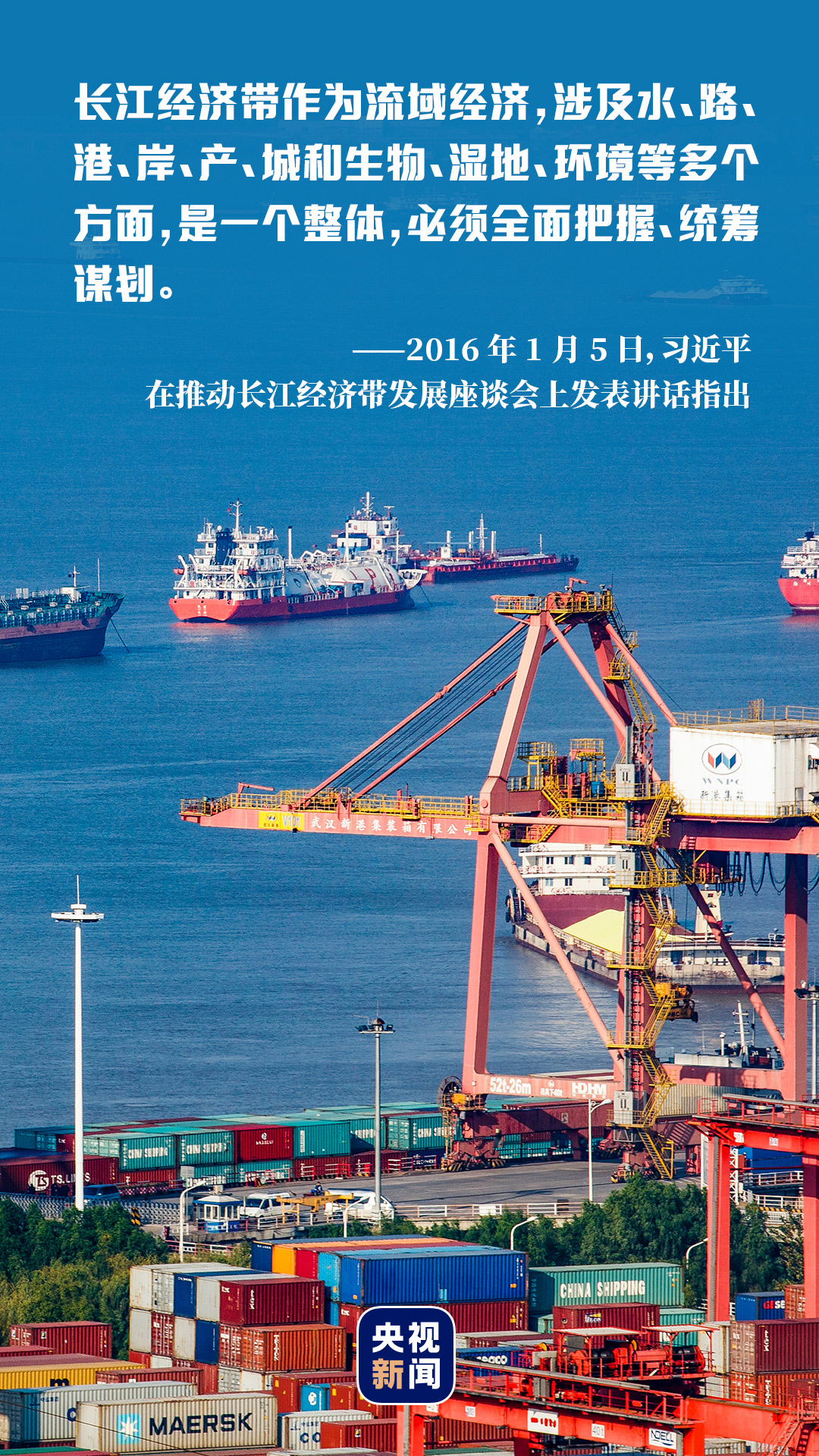 在果园港码头,习近平步行前往码头前沿平台,视察长江航运和港口装卸作业。