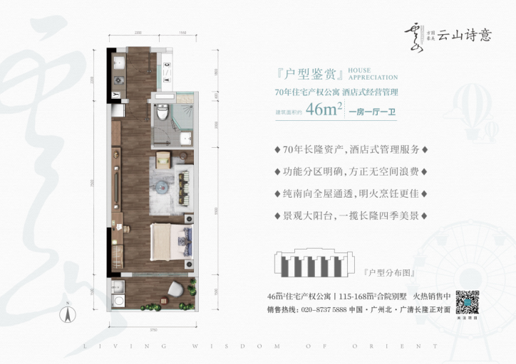 方圆豪美·云山诗意约46㎡70年住宅产权公寓,空间南向布局,室内可使用明火,带珍罕景观大阳台。首付5万起,不限购,比一般公寓多收益30年,小投资即可撬动广清长隆千亿大资产。
