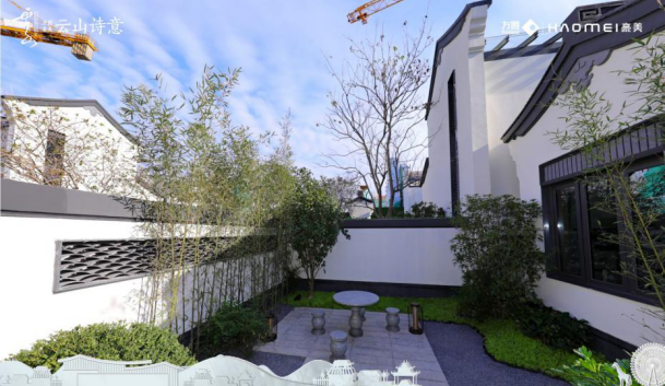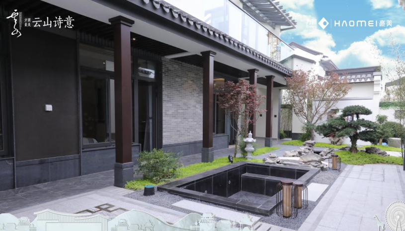 得益于超低容积率以及围合式的设计,方圆豪美·云山诗意的合院产品通过设计布局,把所有的花园都集中起来,相较于传统别墅花园一般分散在四周,合院的花园利用率真正意义上达到100%,每一个功能区打开窗都可以看到院子,每个空间都可以看到景观。一花、一草、一石、一雕,传达中式园林的造景意境。亭台戏水、卵石散置等,方寸皆是中式情怀的延续。