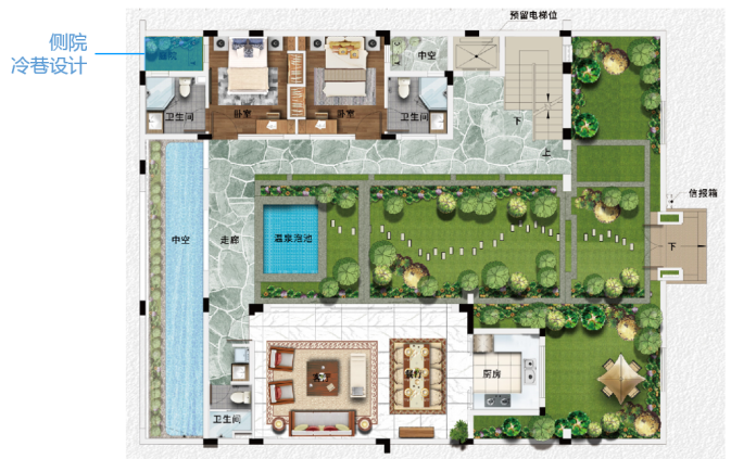 侧院空间虽狭长,但在产品设计上,却有它独一无二的优势,便是我们的冷巷设计。冷巷是江南建筑的特点,其独特的对流自主通风作用,使得整个合院产品的舒适度得到升级。