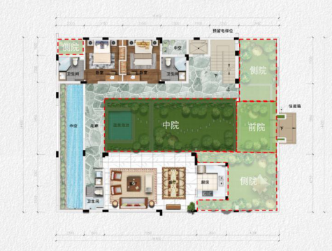 前院作为归家的第二道门仪,开门步入尺度适宜的前院,迎面是照壁的设立,它界定了一个场所,形成了一个空间。主院两侧分别是我们的休闲区(客餐厅)、居住区以及边院,功能动静分区明显,每一处院子都是独立而且连接的户外空间。
