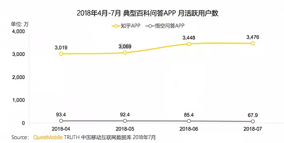 可是,谁也没有想到高光的逝去也这么快。QuestMobile数据显示,2018年4月-7月,悟空问答MAU节节下滑,7月MAU仅67.9万。也就在这一月,悟空问答被并入微头条,团队100多人转岗,其市场总监刘晨离职。