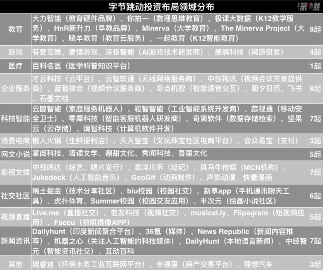 这样的形容不可谓不形象。截至2020年11月,据不完全统计,字节跳动已经布局了社交社区、文娱传媒、游戏、人工智能、企业服务、教育培训、医疗健康等11个赛道,涵盖消费互联网到产业互联网,“拳打”腾讯,“脚踢”阿里,被互联网验证成功过的领域,几乎都散落着字节跳动的野心。