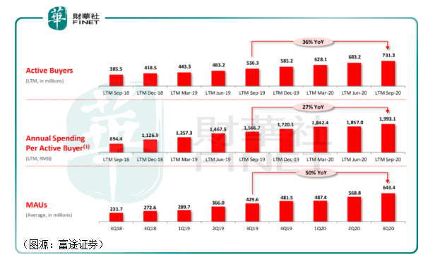 平台活跃买家(指特定期间曾在拼多多平台下单的用户)达到7.313亿,同比增长36%;第三季活跃用户净增4810万。