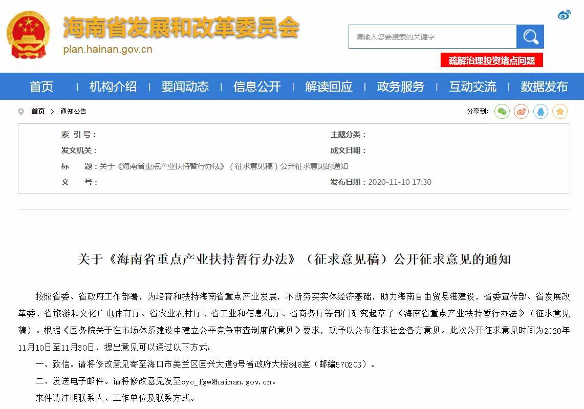 近日,按照海南省省委、省政府工作部署,为培育和扶持海南省重点产业发展,不断夯实实体经济基础,助力海南自由贸易港建设,海南省省委宣传部、省发展改革委、省旅游和文化广电体育厅、省农业农村厅、省工业和信息化厅、省商务厅等部门研究起草了《海南省重点产业扶持暂行办法(征求意见稿)》(以下简称《办法》),《办法》重点支持旅游业、现代服务业和高新技术产业“三大领域”“十二个重点产业”和其他符合海南省发展定位的新兴产业。公开征求意见的时间为11月10日至11月30日。