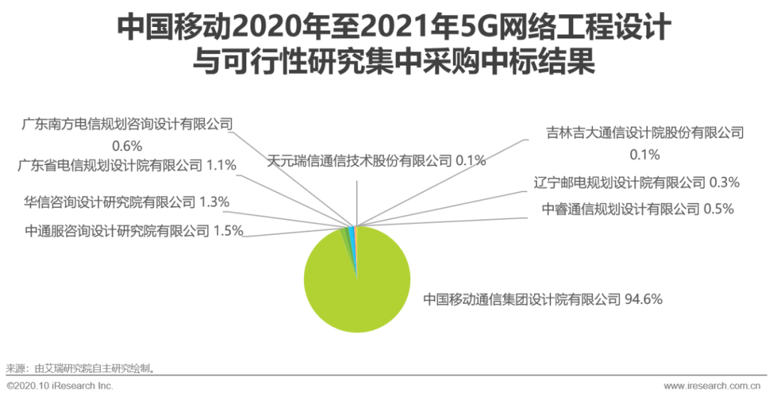 5G网络规划是根据5G技术特点,使用频段及实际的物理环境等进行站址及建设方案的规划,是5G网络生命周期的开始,是5G新基建政策下,最先受益的环节。目前,我国通信规划企业大致可分为运营商设计院,民营设计院,高校控股的设计院及国企设计院四类,其中运营商旗下的设计院具备绝对优势,市场份额高,尤其是电信旗下的,移动与联通均持股的中国通信服务有限公司。下面主要以中移动5G网络规划集中采购为例进行分析。2019年11月份,中移动公开发布了2020年至2021年通信工程设计与可行性研究集中采购,其中5G网络部分的规模约280亿元。中国移动旗下的中移设计院中标份额高达265.1亿,占比94.6%,电信旗下的中通服咨询、华信、广东电信、广东南方电信及中睿通信设计院累计中标14.1亿,占比约5%,运营商旗下的设计院中标份额累计约99.6%。可见,在5G网络规划中,运营商设计院占据绝对优势,非运营商的通信设计院受益小,很难享受到5G新基建带来的红利。