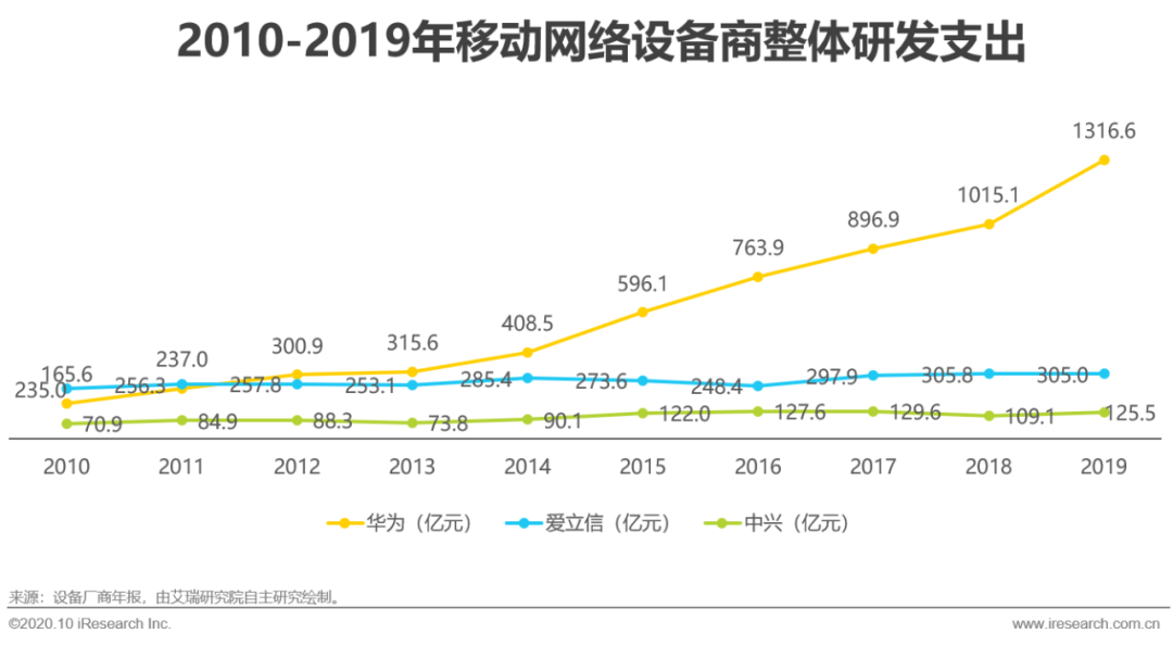 促进技术更加成熟是移动网络发展的首要任务。运营商与设备厂商持续的研发投入是移动网络技术不断演进的保障。相较于2G/3G/4G来说,5G第一次将以人为中心的通信扩展到以人与物为中心的通信。5G实现万物互联的能力为产业的发展带来了无限的想象。各国对5G的高期待,导致标准还未成熟就已经开始商用。虽然我国已经开始基站的规模部署,但主要是基于R15的部署,能满足eMBB的应用。加5G速基建,除加速基站建设速度以外,还需要加速5G技术的发展,以建设高质量的5G网络,赋能行业应用的发展。从移动网络主设备厂商近十年的整体研发支出来看,整体呈上升趋势,但近两年爱立信与中兴趋于稳定。当前,5G行业应用仍在发展初期,需要标准、产品及解决方案不断的发展。因此,设备商与运营商均应持续加大研发投入,促进5G技术不断发展。