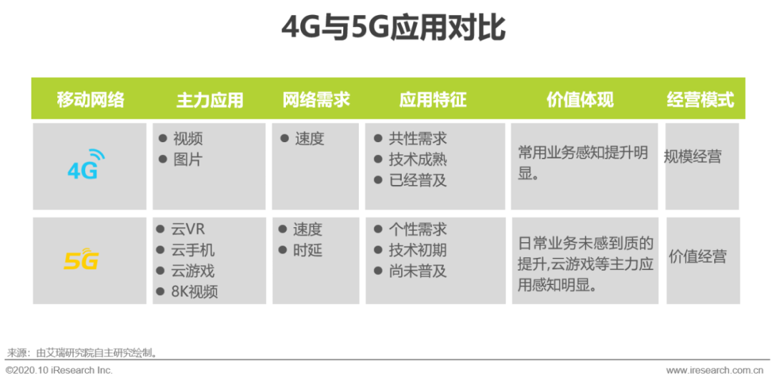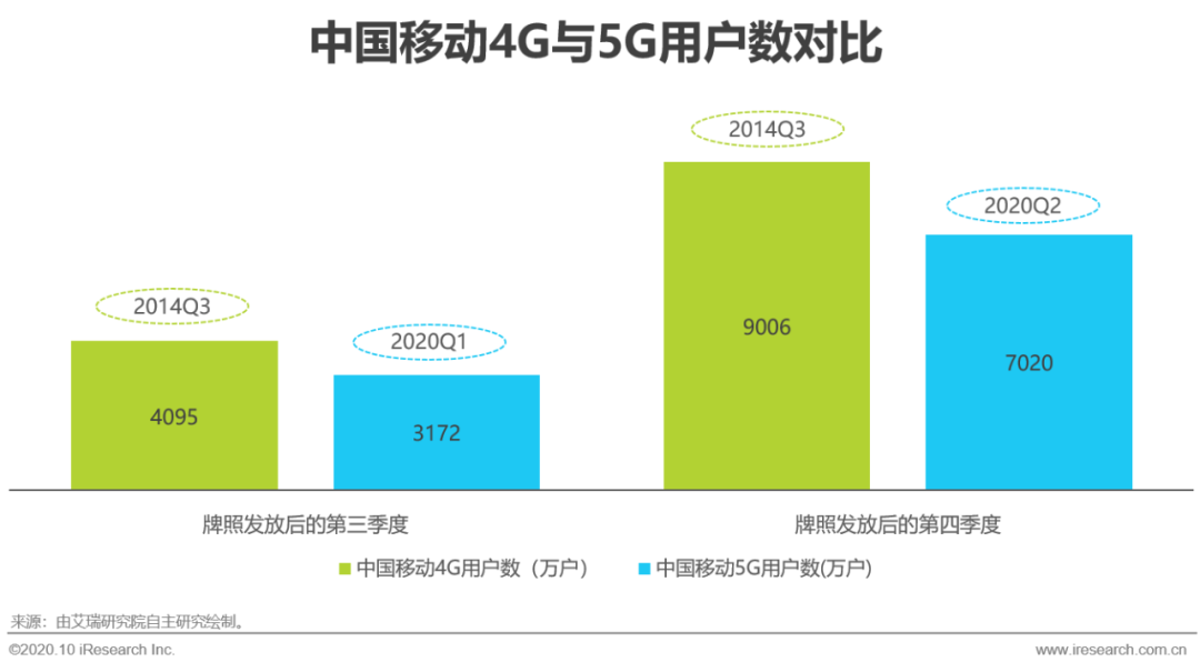 应用是5G新基建发展的持续动力。相较于4G,5G用户的发展速度较慢。以4G与5G用户均处于领先地位的移动进行分析,在5G发放牌照后的第四季度,5G用户量达到了7020万户,但4G牌照发放后的第四季度,4G用户数量已经达到了9006万户。就移动视频来说,3G时代已经开始发展,是一个基本与共性的需求,但3G网络性能无法支撑其良好的体验。4G网络更快的速度能带来更清晰更流畅的视频体验,用户感知提升明显,升级4G意愿强。因此,运营商以流量制定不同档位的套餐,以当时的话费划分高中低端用户,并由高到低规模推广,达到了良好的效果。