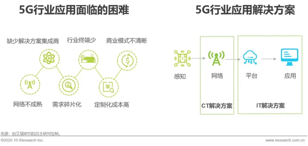 行业应用第一次成为无线蜂窝网络服务的重点应用场景,也将成为通信运营商营收持续增长的驱动力。近两年,运营商与设备厂商积极寻求5G与行业的融合,兑现5G在行业应用中的价值。但行业应用的多样性与复杂性决定了5G与行业融合是一个漫长的过程。部分应用场景尚存在除网络以外的技术瓶颈,也决定了5G行业应用需要分阶段落地。5G行业应用发展存在网络不成熟,缺少解决方案集成商,需求碎片化,定制化成本高,行业终端少,商业模式不清晰等问题,仍需各方持续的努力。当前,5G聚焦的智慧医疗、智慧工厂、智慧能源及车联网等应用场景的解决方案主要由IT解决方案与CT解决方案两大部分组成。5G是CT解决方案的主要组成部分。IT解决方案需要对应用场景充分理解,是5G与行业应用融合的加速器。整体来看,5G行业应用需要按照技术成熟度分阶段落地,已经具备商用条件的早期应用,需加速IT解决方案与CT解决方案的融合,促进其大规模推广。