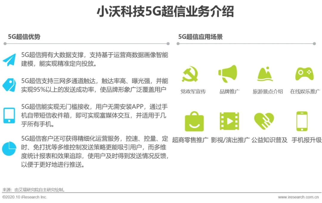 5G超信是中国联通旗下小沃科技的富媒体短信业务,聚合视频、音频、图片、文本等元素,具备联通、移动、电信三网能力,覆盖游戏,金融,旅游等应用场景,具备挂机超信、LBS位置推送、一键关注/添加小程序、一键唤醒APP等功能。