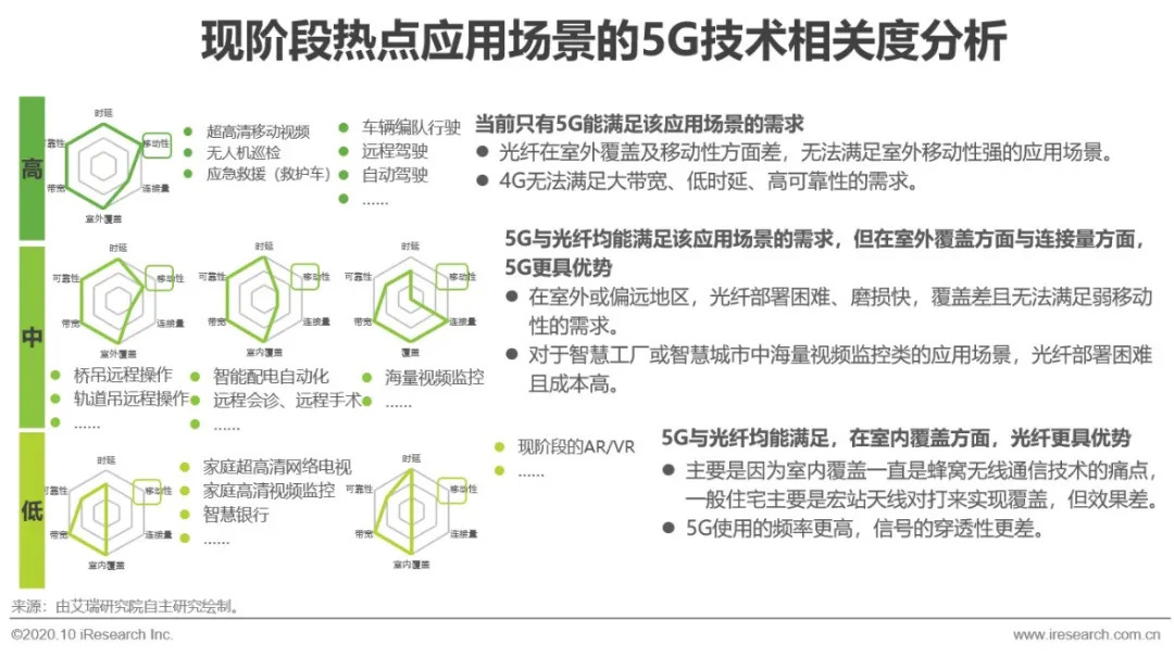 5G的明星效应吸引了大批与之有关的消费级与行业级应用场景。然而这些应用场景是否为真正的5G应用,需要从应用场景的需求出发,分析5G技术的相关度。从带宽、时延、可靠性、移动性、连接量及覆盖六个维度进行对比分析,5G相较于4G的优势在于带宽大、时延低、可靠性高,相较于光纤的优势在于移动性强,连接量大,劣势是室内环境覆盖性差。所以5G在当地产业的落地,在为工业环境提供解决方案的时候,实质上是一系列通信及IT技术的综合。