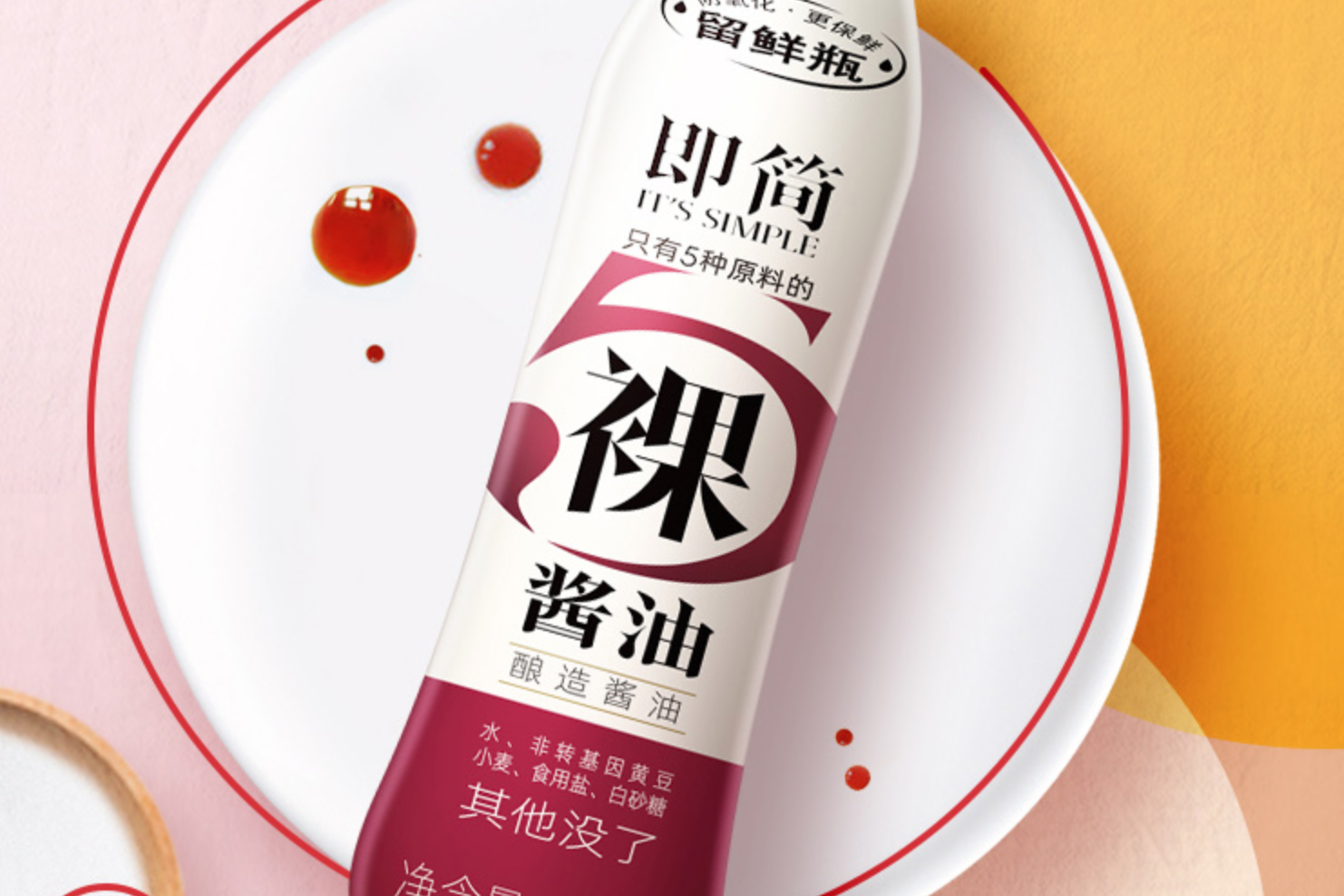 同时,它主打即简配方,强调配料中仅有水、非转基因黄豆、小麦、食用盐、白砂糖5种原料,“其他(配方)没了”。此外,包装采用了双层技术的“留鲜瓶”,据称能够防止酱油氧化、保持口感。