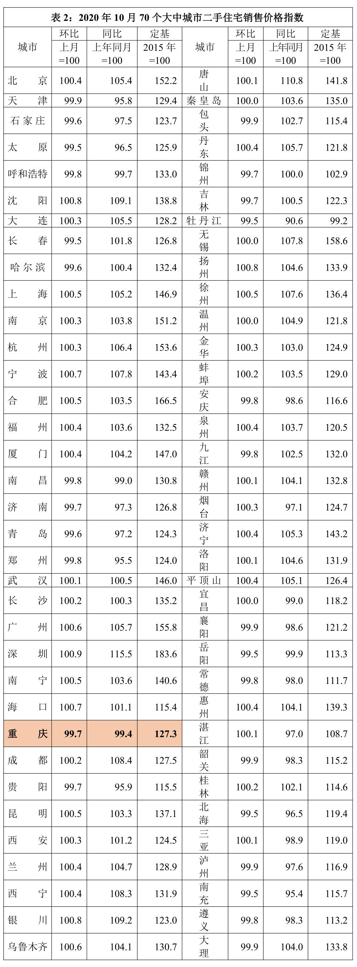 11月16日,国家统计局发布了2020年10月份70个大中城市商品住宅销售价格变动情况统计数据。其中,重庆新建商品住宅销售价格环比上涨0.2%,同比上涨5.4%。二手房价格环比下降0.3%,同比下降0.6%。而全国70大中城市二手房价大多在涨。