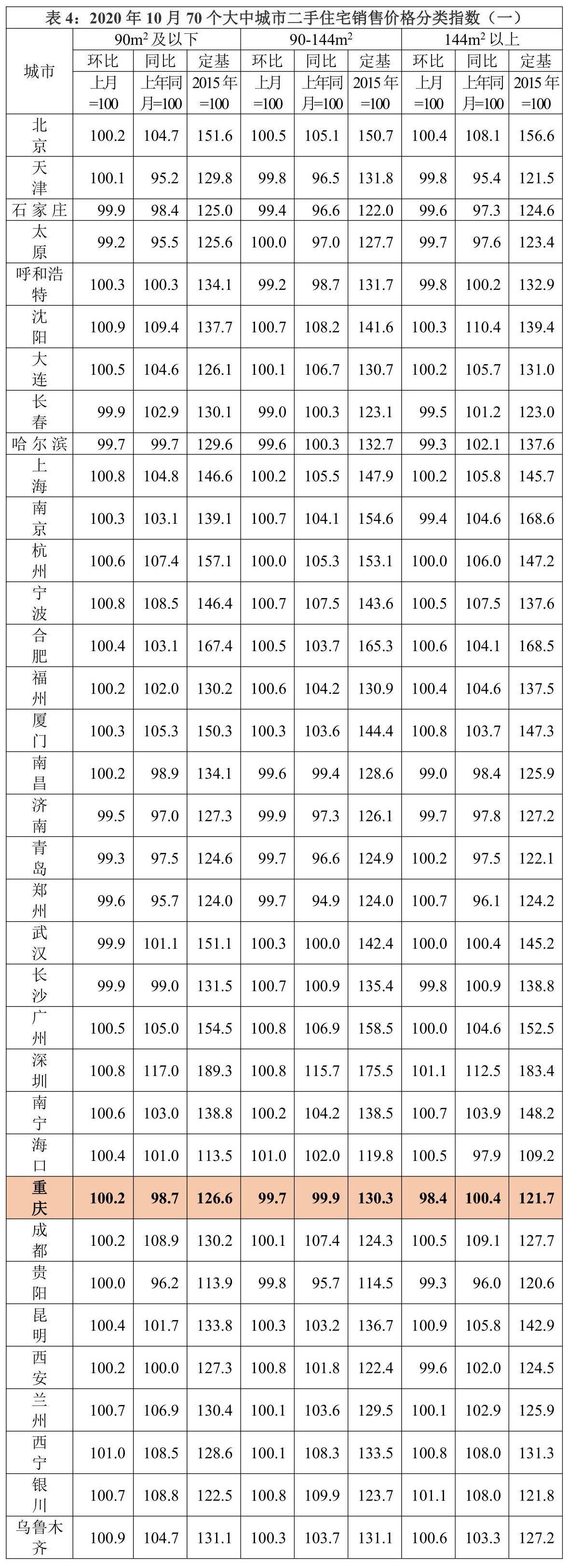 国家统计局数据显示,10月重庆90平米及以下的二手住宅销售价格环比上涨0.2%,同比下降1.3%;90-144平米的二手住宅销售价格环比下降0.3%,同比下降0.1%;144平米的二手住宅销售价格环比下降1.6%,同比增长0.4%。