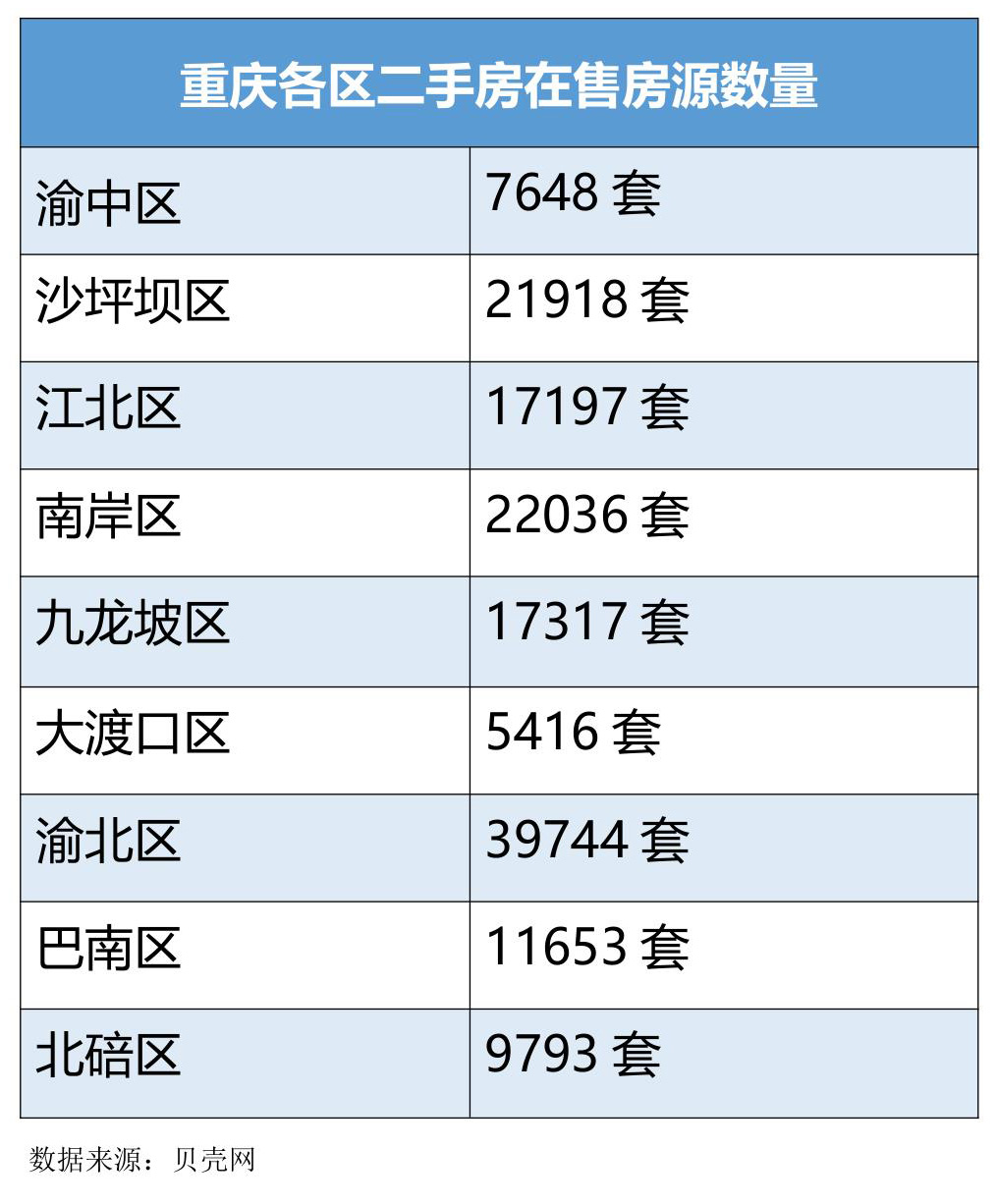 综合三家房产经纪公司的数据,重庆二手房存量超过17万,其中存量最大的是渝北区,在售二手房源在4万套左右,存量最小的是大渡口区,但也有超过5千套的二手房源。