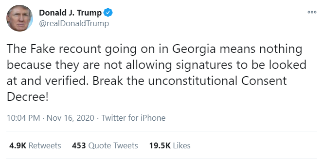 11月16日消息,特朗普刚刚在推特发文称:“佐治亚州进行的虚假重新计票毫无意义,因为他们不允许查看和验证签名。取消这违宪的‘同意令’(Consent Decree)!”