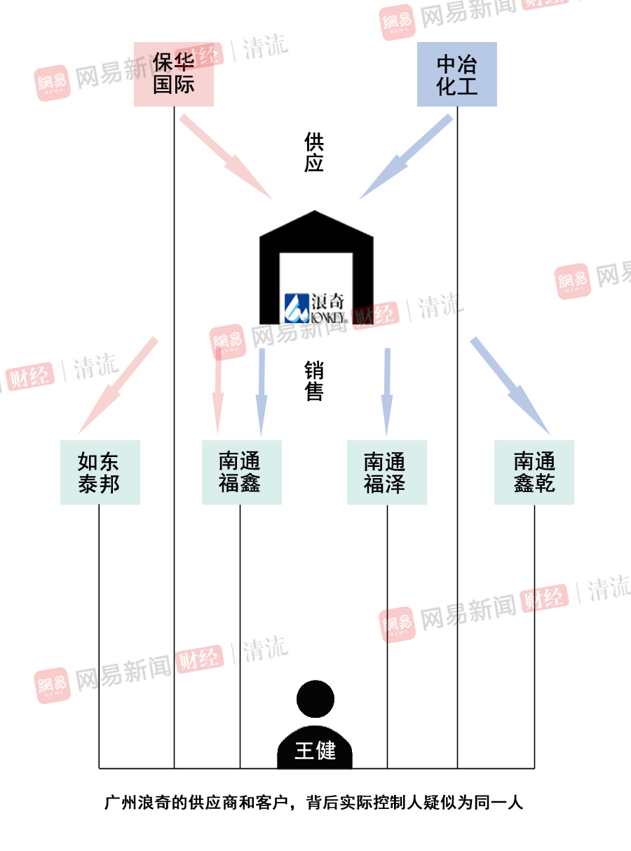 根据清流工作室的调查,广州浪奇多笔贸易业务均围绕大股东王健旗下的公司展开。这些贸易的套路相似:先是广州浪奇向王健暗中控制的公司采购工业原料,然后广州浪奇再转买给王健暗中控制的另一批公司。高明之处在于,这些公司在表面的股权上,看不出与王健有任何关系。