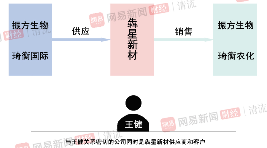 除了广州浪奇、九九久、达志科技,王健疑似还“帮助”过正在申请A股主板上市的犇星新材。犇星新材今年6月向上交所递交的招股书显示,2017年它的客户包括江苏振方生物化学有限公司(下称“振方生物”)和琦衡农化。同样是2017年,犇星新材的供应商为振方生物与江苏琦衡国际贸易有限公司(下称“琦衡国际”)。2018年,振方生物再次同时成为犇星新材的客户和供应商。