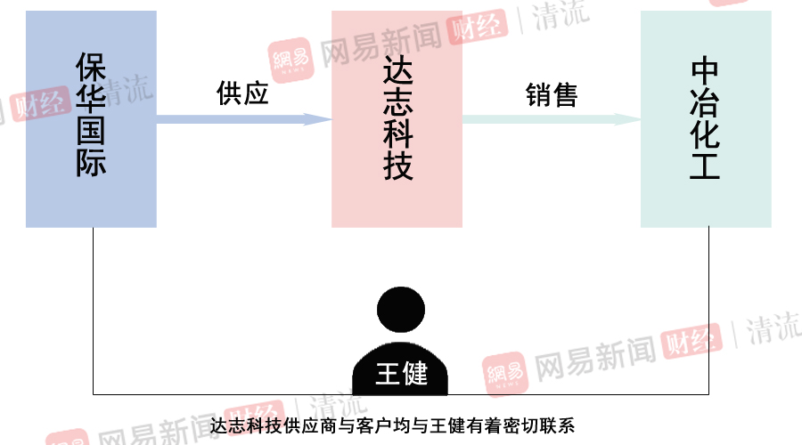 根据深交所创业板上市公司达志科技2019年的年报回复函,2018年和2019年,达志科技的第一大客户均为中冶化工,第一大供应商均为保华国际。回复函显示,在连续两年内,这两家王健控制的公司,向达志科技采购和供应的商品一模一样,金额也相差无几。在深交所注意到中冶化工和保华国际不仅通讯地址、电话、邮箱地址相同,且两者均为贸易商后,向达志科技下发多份问询函,反复询问其与中冶化工、保华国际的交易是否具有商业实质。