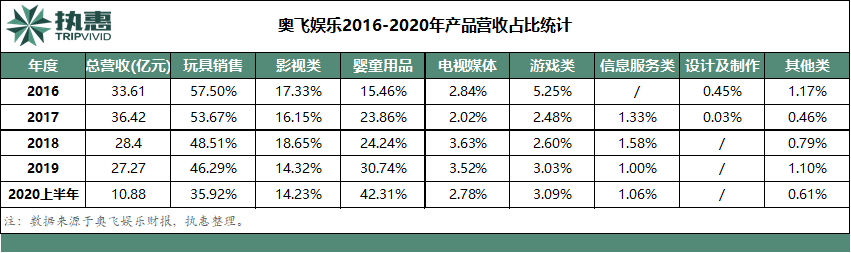 而真正实现IP变现的是消费品制造与营销,2016年时这一业务仅包含动漫玩具、非动漫玩具和婴童用品。尽管这一年的玩具销售额占全年总营收的57.5%,但过度依赖单一业务也意味着变现能力较弱。2016年至今,奥飞娱乐的玩具营收占比随业务结构调整而逐年下降,原创IP价值无法得到更大程度的开发。