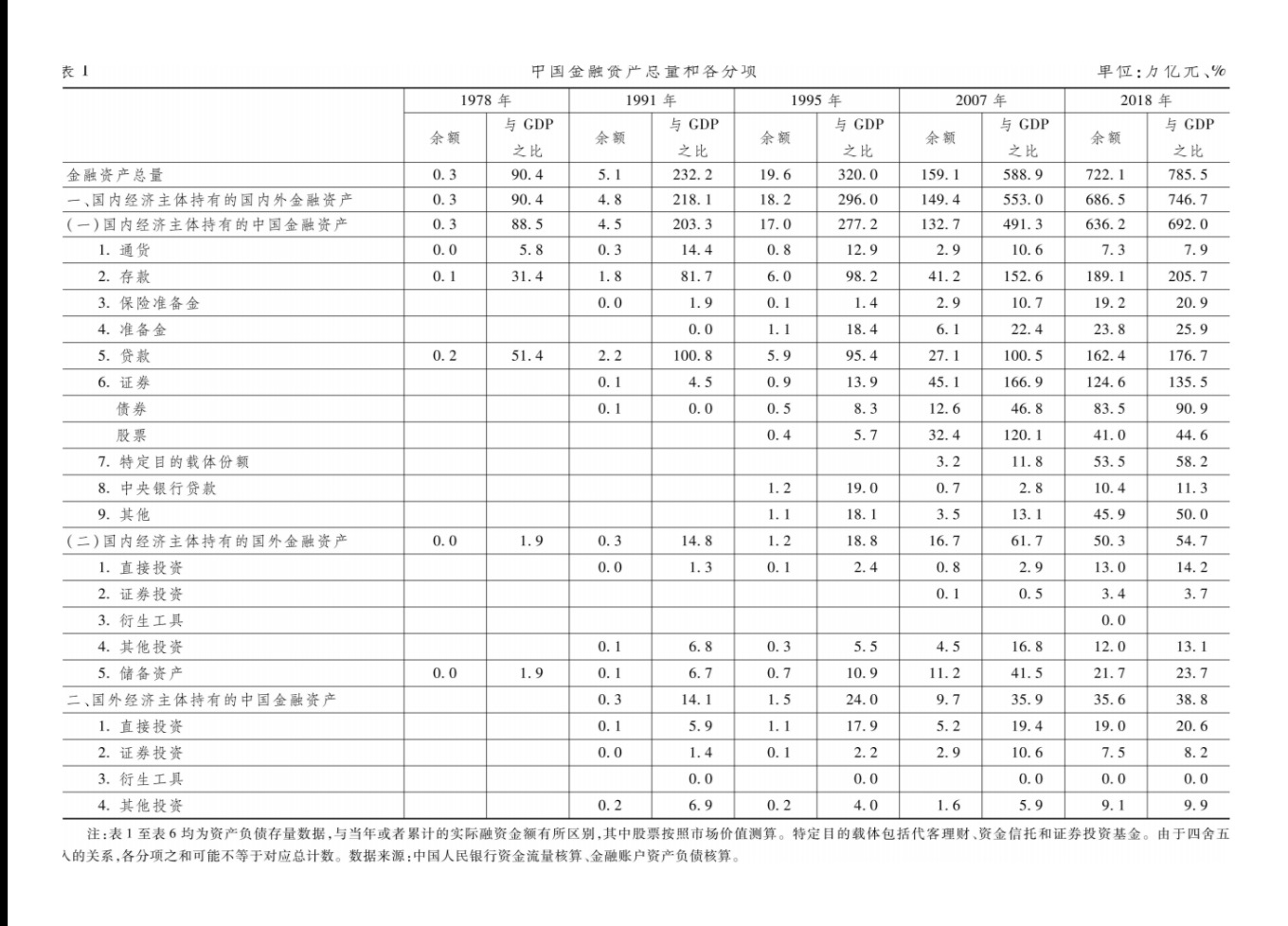 本节首先对 2018 年中国金融资产总量及各分项进行测算。为便于进行更大跨度的比较分析,还重新测算并给出了 1978 年、1991 年、1995 年和 2007 年四个时间节点的金融资产数据。其中,1991 年为上海和深圳 证券交易所营业的首个完整年度,标志着我国资本市场发展的起点;1995 年和 2007 年则分别为易纲(1996)、易纲和宋旺(2008)统计数据的截止时点。