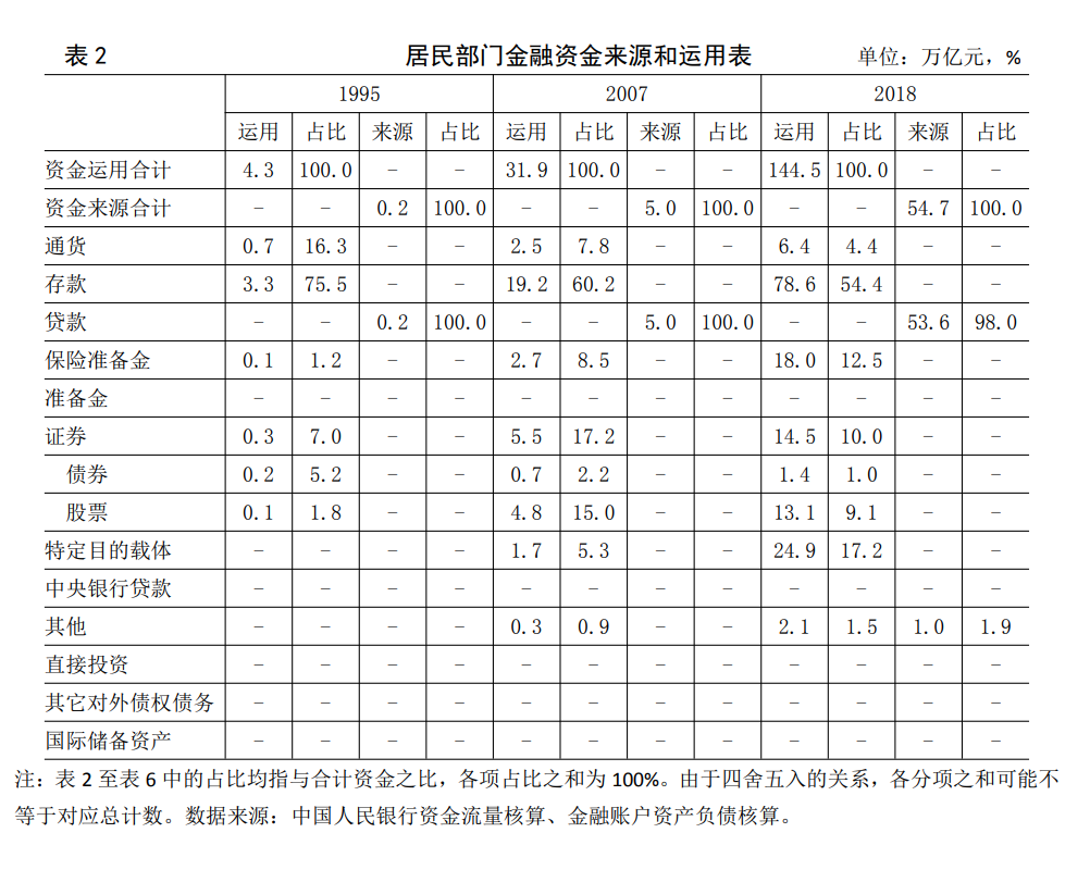 为更清晰地观察 2008 年至 2018 年中国金融资产结构出现的变化,本节从分部门的视角,进一步对居民、企业、政府、金融机构和国外等五部 门的金融资产和负债结构分别进行分析。表 2 至表 6 分别给出了上述五个 部门 1995 年、2007 年和 2018 年金融资金来源(负债)和运用(资产) 的测算结果。其变化主要表现在: (1)居民部门的资产结构更加多元。随着资管业务迅速发展,居民 部门持有的理财、信托、基金等资产规模快速增长。2018 年末,居民部 门特定目的载体总额自 2007 年末以来年均增长 27.6%,占资金运用总额 的比重达 17.2%,较 2007 年末上升 11.9 个百分点。投资渠道的多元化使 居民资产配置不再高度集中于银行存款。2018 年末,存款占资金运用总 额比重为 54.4%,虽仍占一半以上,但较 2007 年末降低了 5.8 个百分点。 由于股票资产增长较慢,2018 年末居民部门持有股票占比(本节所称占比均指与合计资金之比,各项占比之和为 100%)较 2007 年末降低了 5.9 个百分点。